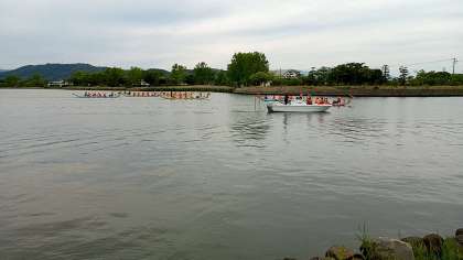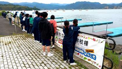 「頑張れー」と湖岸で応援する生徒の声がこだましています。なお、前半レース優勝は4班でした。