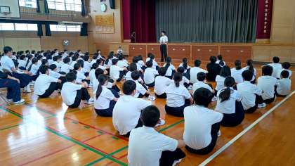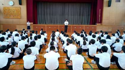 始業前に学年集会を開いています。1年生は水曜日、2年生は木曜日、3年生は金曜日です。写真は、今朝の2年生学年集会の様子です。