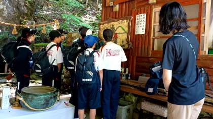 蟷螂の岩屋について説明を受けています。真っ暗な洞くつのなかを散策します。足もとに十分気をつけて、行ってらっしゃい!