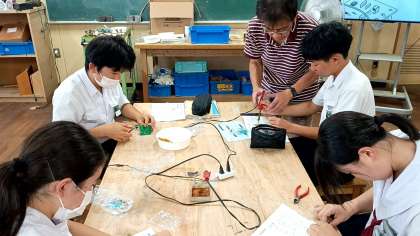 はんだを工具で加熱し、必要な箇所を接合する実習に取り組んでいます。
