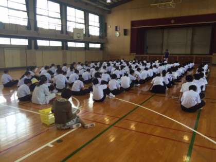 1年学年集会(一泊移住しおり説明)