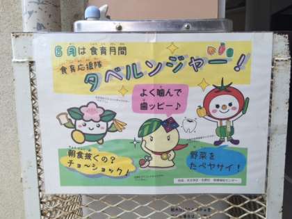 6月は食育月間ということで、「タベルンジャー」が登場して、それぞれメッセージを送っています。廊下を通ったら見てくださいね。