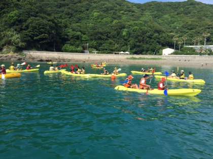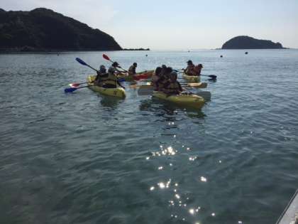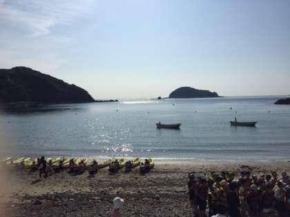 もうすぐカヌー・カヤック体験終了です。三枚目の写真、中央の小さな島の左手前に小さくて見づらいですが、潜水艦が通っています。珍しいですね。実際はもっと大きく見えてました。生徒たちも「うおー」と声をあげてました。