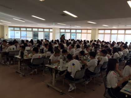 夕食の様子です。メニューはハンバーグです。ごはんのおかわりに行列が出来ていました。