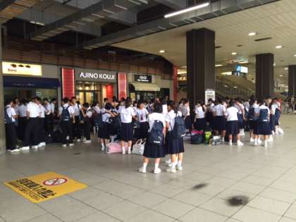新大阪の集合場所、7時10分です。集合20分前ですが、すでにたくさんの生徒が集まっています。