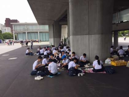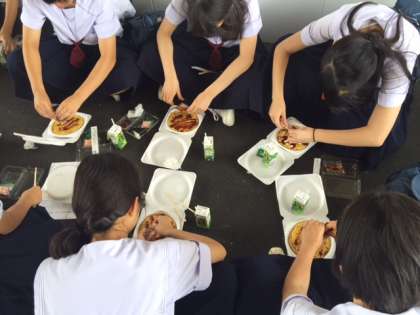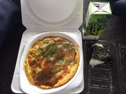 お昼ごはんです。お好み焼き弁当なるものをいただいています。なかなか好評です。