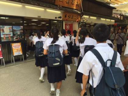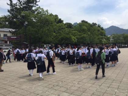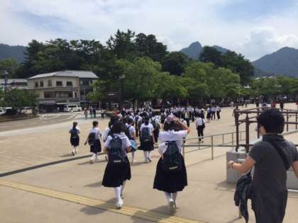 宮島チーム、到着。もみじ饅頭づくり体験に向かいます。