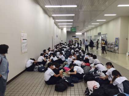 広島駅待機が15分経過しましたが、列が広がることなく座っています。通行する一般の人が「きちんと並んで座ってるなあ」と言ってました。