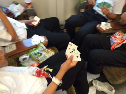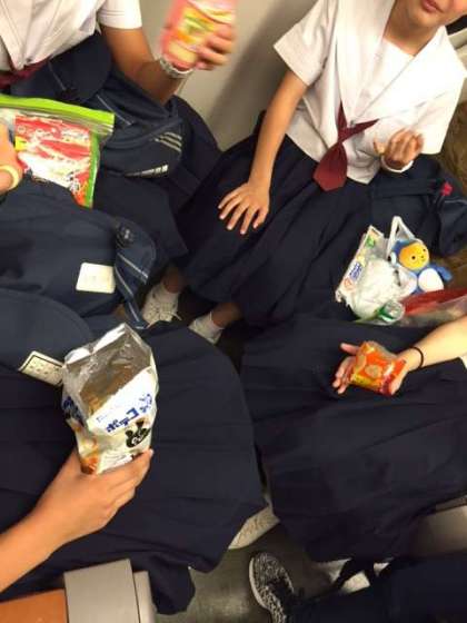 新幹線車中、どこもかしこもお菓子・トランプ・・・。