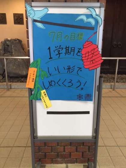 生徒会の設定した7月の目標がピロティに掲げられています。後10日で一学期が終了します。自分自身をしっかりと見つめ直して、いい形でしめくくりましょう。