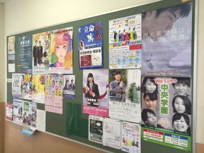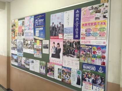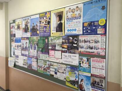 3年生の教室前廊下の大きな掲示板に高校案内ポスターが貼られています。4枚の掲示板すべてにところ狭しと貼っています。3枚しか紹介できませんが、写真のような感じになっています。体験入学や学校公開日等の案内が掲載されていますので参考になると思います。保護者の方も懇親会に来校されましたら是非ご覧ください。