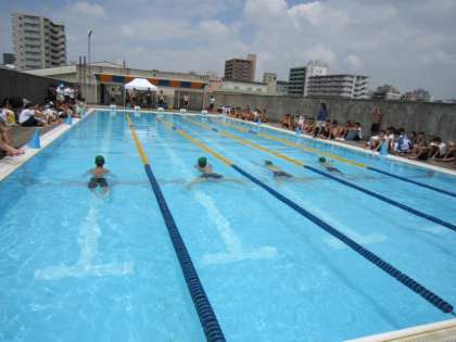 7月14日、3年生の水泳大会が行われました。晴天すぎて暑かったのですが、みんな元気一杯泳ぎました。