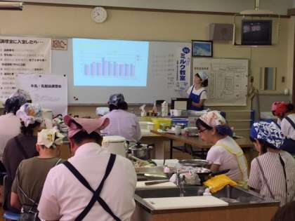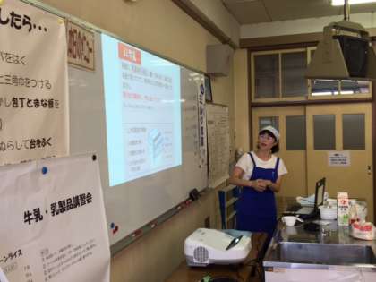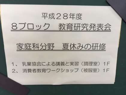 8月4日、本校において8ブロック教育研究発表会が行われました。あわせて夏休みの研修として市内家庭科の先生の研修も行われました。午前は乳業協会による講義があり、その後調理実習を行いました。