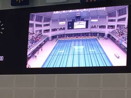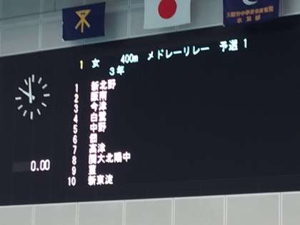 いよいよ競技の開始です。第1レースは3年女子400mメドレーリレーです。高津中学校は7レーンを泳ぎます。