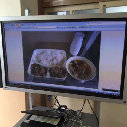 給食2日目です。3年生はエレベーターで3階まで運ばれた給食を教室に持っていきます。そのため当日の盛り付けサンプルを見ることができません。今日から1組横の資料室の前に電子黒板を置いてサンプルを映し出しています。下は3年生の給食の様子です。