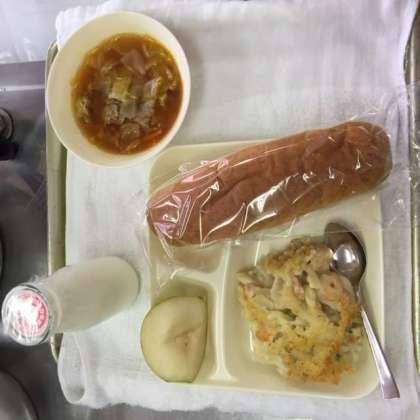 今日の給食は初めてパンが出ました。献立はエビグラタン・トマトスープ・二十世紀なし・ライ麦パン・牛乳です。