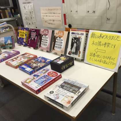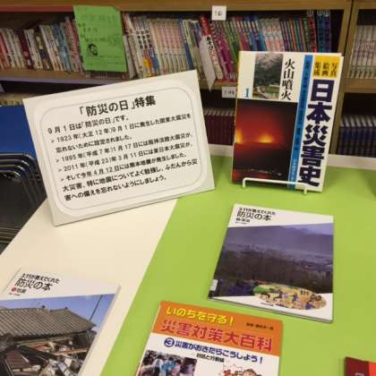 毎週火曜日は学校図書館補助員の方が来られています。しかし、給食が始まってなかなか図書室へ行く時間がないようです。図書室では防災や新規購入した本のコーナーが設置されています。