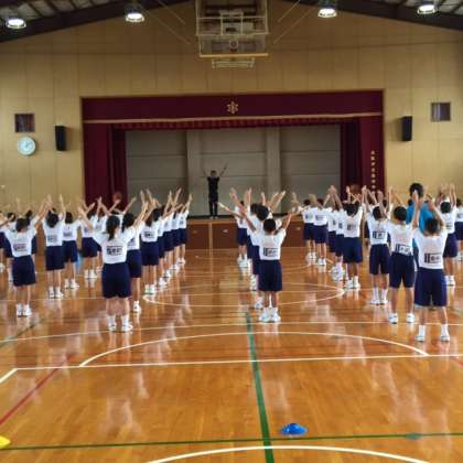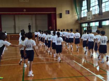 グランド状態が悪いので体育館でラジオ体操や行進の練習をしています。指先まで神経を行き届かせて頑張りましょう。