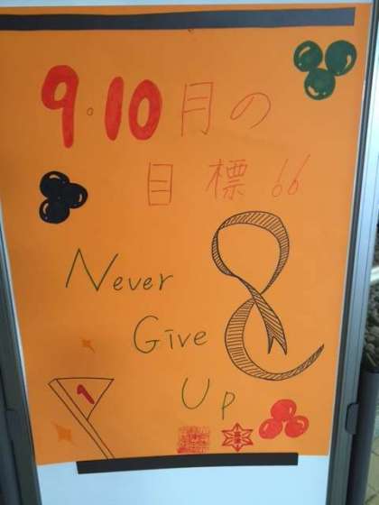 9月8日の生徒評議会で決定した9・10月の目標は「Never Give Up」です。皆さん、何ごともあきらめずに一生懸命頑張りましょう。