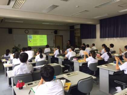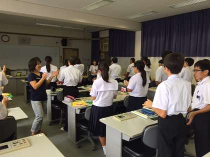 1年英語の授業の様子です。英語の文章を歌に合わせて手拍子をしながら楽しく学んでいます。Clap your hands !