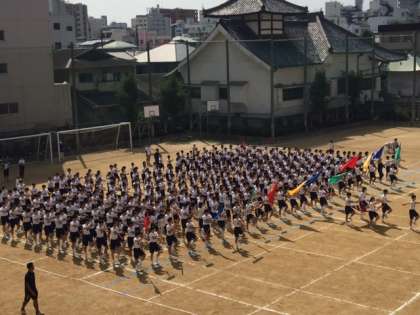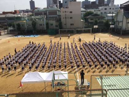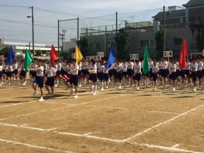 9月16日、一回目の体育大会合同練習を行いました。まず整列、行進の練習です。三学年が揃って行進するのは今回が初めてです。おおむね形は出来ていると思いますが、まだまだ精度を高める必要があります。