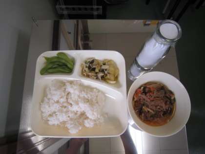 9月28日(水)、本日の給食は、マーボーなす、チンゲンサイともやしの甘酢和え、枝豆です。