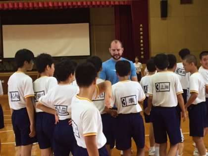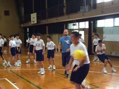 10月3日、Pearce先生が英語以外の教科を参観および体験をしています。まずは2限目に2年の社会・理科を参観しました。3限目は1年の体育の授業に入り込んでいます。体育大会のビデオを鑑賞した後、生徒に混じってドッヂボールを体験しました。残念ながら2試合とも当てられてしまいました。