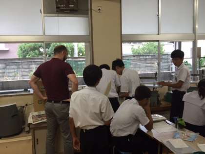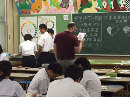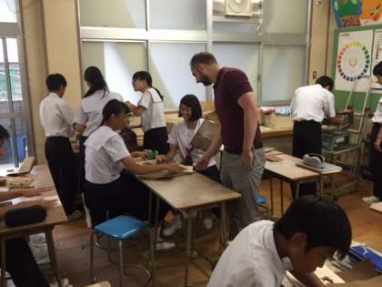 4時限目は2年美術の授業に入って何やら話しかけています。板を切り抜いてパズルを作成しているのですが、アドバイスしているのでしょうか?生徒の皆さんの英語理解力が問われますねえ。