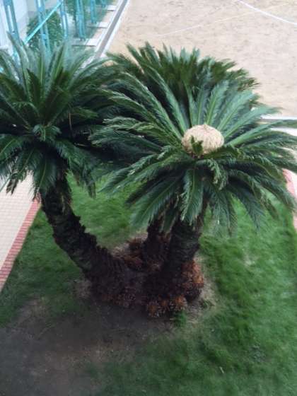 “高津の礎”其の七で紹介しました「三本のソテツ」ですが、二階にある職員室前の廊下窓からのぞくと三本のうちの一本に直径50cmもあろうかと思われる大きな花を咲かせています。見た目は巨大な玉ねぎを剥いたような感じをしていますが、これは雌の木に咲くりっぱな花だそうです。花だということに気づいていない人も多いのではないでしょうか。ソテツは恐竜時代に栄えた植物の生き残りで、いちょうや松と同じ裸子植物です。雌雄異株で、それぞれ違った形状の花を咲かせるそうです。写真の花は雌株に咲いた雌花になります。ソテツの花は10年・20年に一度咲くとも言われ、非常に珍しいそうです。(毎年咲くものもあるらしいですが・・・)歴史ある高津中学校のシンボルになりつつあるのでは?「蘇鉄」(ソテツ)という名の由来は、枯れかかった時に鉄釘(てつくぎ)を打ち込むと蘇ることからきているようです。職員室のある校舎の2・3階の廊下窓から見ることができますので機会があればどうぞ鑑賞してください。