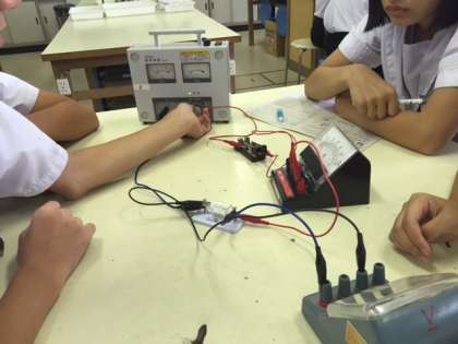2年理科の授業の様子です。電気の流れについて学習しています。電流計、電圧計、電源装置を使って電気の流れを調べています。