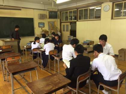 中間テストが終わって、文化祭に向けての取り組みが行われています。3年生は劇です。場面での合唱や音響係の様子です。