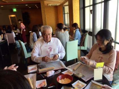 現地に到着しました。まずは生八つ橋作り体験です。手袋が入らず破壊してしまった校長も素手で参加しています。皆さん、うまくできましたか?