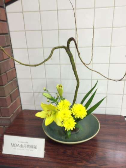 新たな生け花がピロティに癒しの空間を作っています。あざやかな黄色が目をひきます。