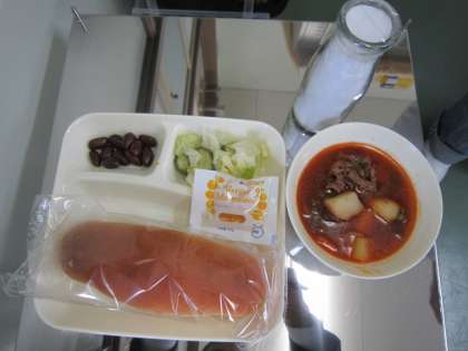11月7日(月)、本日の給食は、牛肉と野菜の洋風煮、キャベツときゅうりのサラダ、うずら豆のグラッセです。
