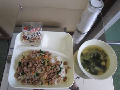 11月11日(金)、本日の給食は、ビビンバ、わかめスープ、アーモンドフィッシュです。