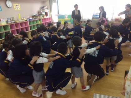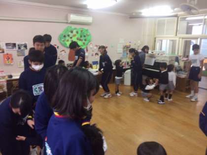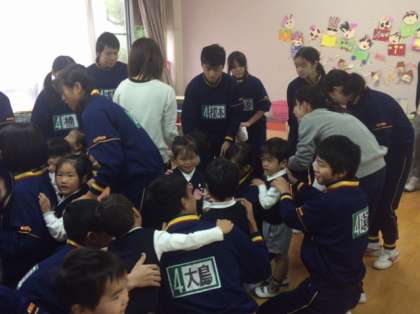 みんな一緒にお遊戯もありました。いいお姉さん・お兄さんですね〜。こんな一面があるのかと思いました。日常では見れない表情が出て、いい経験になりました。幼稚園の皆さん、ありがとうございました。