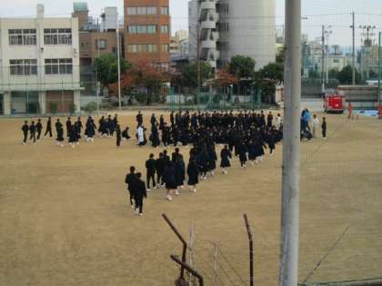 午後2時35分、非常ベルがなり、授業を行っている各教室から放送の指示に従って、全校生徒がグラウンドに避難しました。