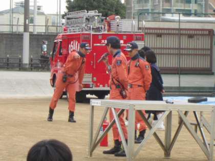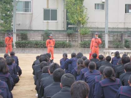 避難指示が出てから3分半、全員が避難完了。消防署員より消火器の説明を受けた後、代表生徒による水消火器の訓練を実施。署員より「消火剤は15秒しか噴射しません。火元に近づいてからピンを抜くように。火元をねらって。。。常時から、消火器の位置を確認するなど、防災を心がけましょう。」とのアドバイスをいただきました。