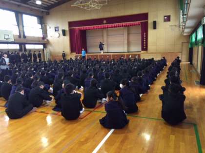 11月21日、全校集会を行いました。生活指導の先生から風邪などひかないよう体調管理をしっかりすることという話がありました。その後、校長先生から期末テスト一週間前にあたり、「心技体」の充実について、やる気を出し、しっかりと復習し、体調を整えて頑張りましょうという話がありました。