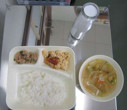 11月21日(月)、本日の給食は、千草焼き、すまし汁、ツナと三度豆のそぼろ です。
