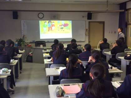 1年英語の授業の様子です。何やら面白いおばあちゃんの話のようですね。先生が画面を示しながら英語で話をしてくれました。おばあちゃんの動きに笑いも出ていました。