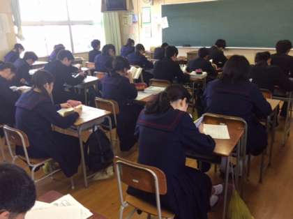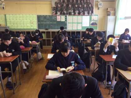 12月1日〜21日、読書週間になっています。毎朝登校後8時25分頃から45分まで各学級において全員で静かに自分が選んだ本を読んでいます。写真のような様子ですので廊下を歩いていても教室に誰もいないのかと思ってしまいます。昨日の新聞記事では読書量が課題になっていますが、本校では読書についての取り組みにも力を入れています。