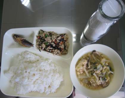 12月8日(木)本日の給食は、いわしのしょうが煮、かきたま汁、高野どうふのいり煮です。