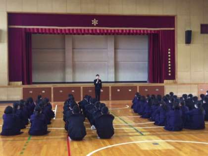 本日、各学年とも学年集会を行いました。1年は2時間目、2年は3時間目、3年は4時間目です。写真は3年生の学年集会の様子です。まず、各クラスの委員長から今学期を振り返って、良かったことや反省点が述べられました。次に保健委員会の代表から健康面についての注意があり、その後、先生方から学習面・生活指導面・健康面について話がありました。しっかりと来年につなげてほしいと思います。
