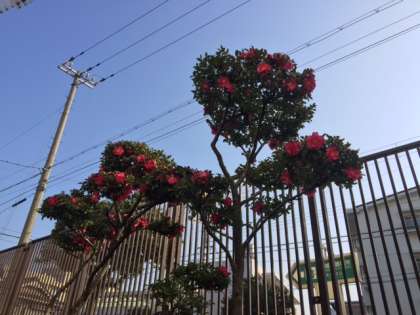 一年生の教室前廊下を東に突き抜けた植え込みに数本の山茶花の木があります。今、あざやかな赤い花がたくさん咲いています。なかなかこの植え込みまで行くことはないので、知らない人も多いと思います。しかし、学校の東側歩道を歩いているとすぐに目につきます。学校の東側歩道を通る機会があれば、一度みていただければと思います。