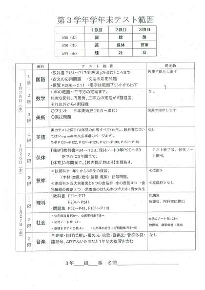 1月25日(水)より3日間、第3学年の「学年末テスト」が実施されます。