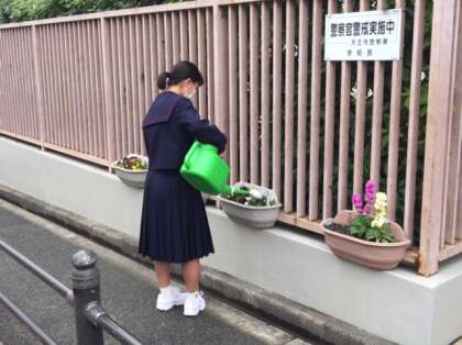 毎朝、生徒会役員の皆さんが交代で玄関プランターの花に水をあげてくれています。ご苦労様です。