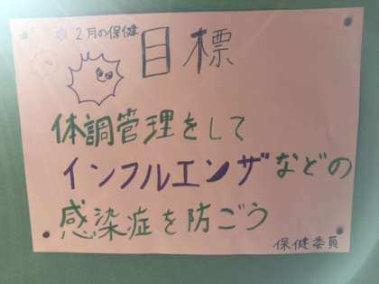 保健室前の掲示板に保健委員会が設定した2月の保健目標が掲示されています。「体調管理をしてインフルエンザなどの感染症を防ごう」です。皆さん、保健だよりなどをよく読んで体調管理に努めましょう。