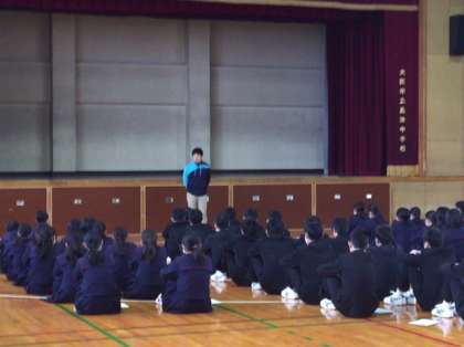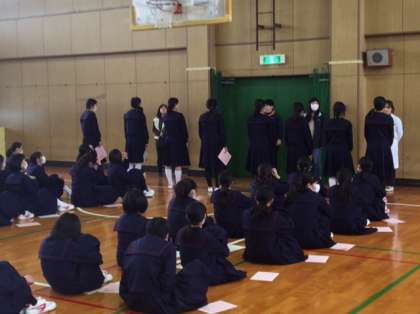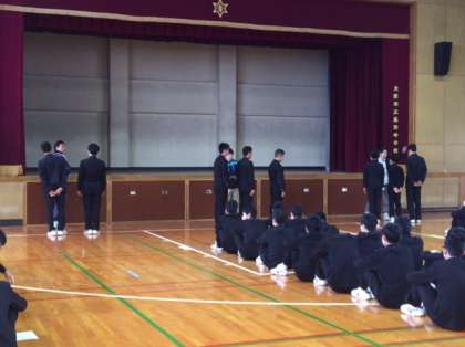 6時間目、体育館で3年学年集会が行われました。山田先生から入試直前にあたっての心構えなどのあと、しっかりとした姿で卒業してほしいとの話がありました。その後、男女にわかれて風紀検査が行われました。