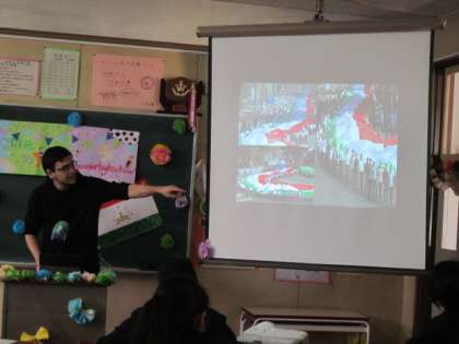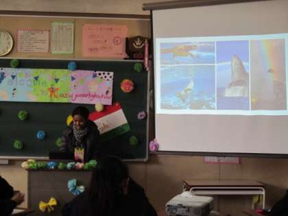 1−4では、アメリカ合衆国とタジキスタンの留学生が自己紹介と、自作のビデオを投影して、自国の説明をしました。
